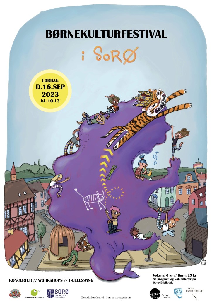 Kom til Børnekulturfestival i hjertet af Sorø by, lørdag den 16. september kl. 10-13. Der vil være sang og musik, dans og teater, billeder, troldespor, spændende fortællinger, sæbebobler, højt til himlen og et flyvende formidabelt fællesskab. Festivalen foregår på Grøn Scene (pladsen mellem biblioteket og Sorø Kunstmuseum) og henvender sig til børn fra 0-7 år og deres familier. Der vil være gratis koncerter udendørs på Grønne Scene og workshops indendørs i Sorø Museum, kunstmuseet og biblioteket, som kræver billetter. Vil I deltage i workshops (4 stks) kræver det en børnebillet til 25 kr. Disse billetter købes på biblioteket eller online. Voksne deltager gratis, sammen med https://soroemusiskeskole.dk