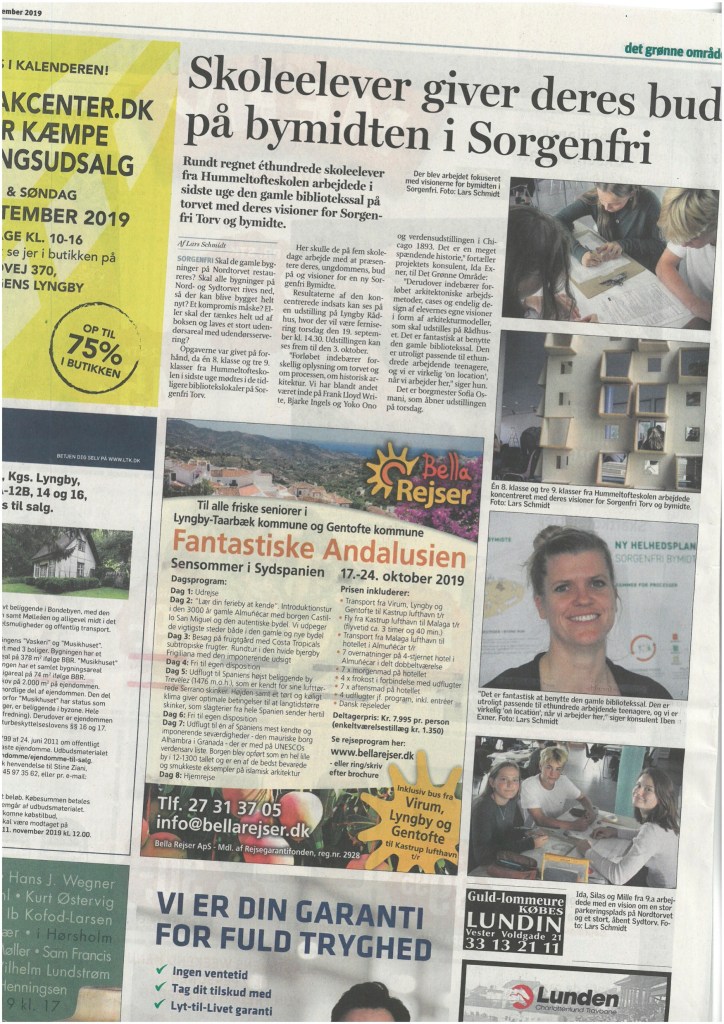 100 elever fra 8. og 9. klasse på Hummeltofteskolen deltog i borgerinddragelsesprocessen om det lokale bytorv, Sorgenfri Torv i september 2019. I fem dage gik de i skole i en tidligere bibliotekssal på selve torvet, mens de lærte om torvets historie og nuværende rolle og udfordringer gennem byvandring, møder med andre lokale, oplæg ved byplanlæggere mv. Desuden blev de undervist i klassiske arkitektur-tegne og modelbygningsteknikker, inden de i grupper designede deres bud på en fremtidsvision for torvet. Elevernes vellykkede tilegnelse af teknikkerne medførte, at resultatet fik et meget professionelt udtryk.